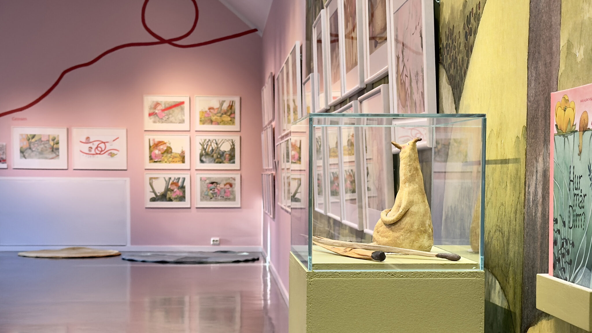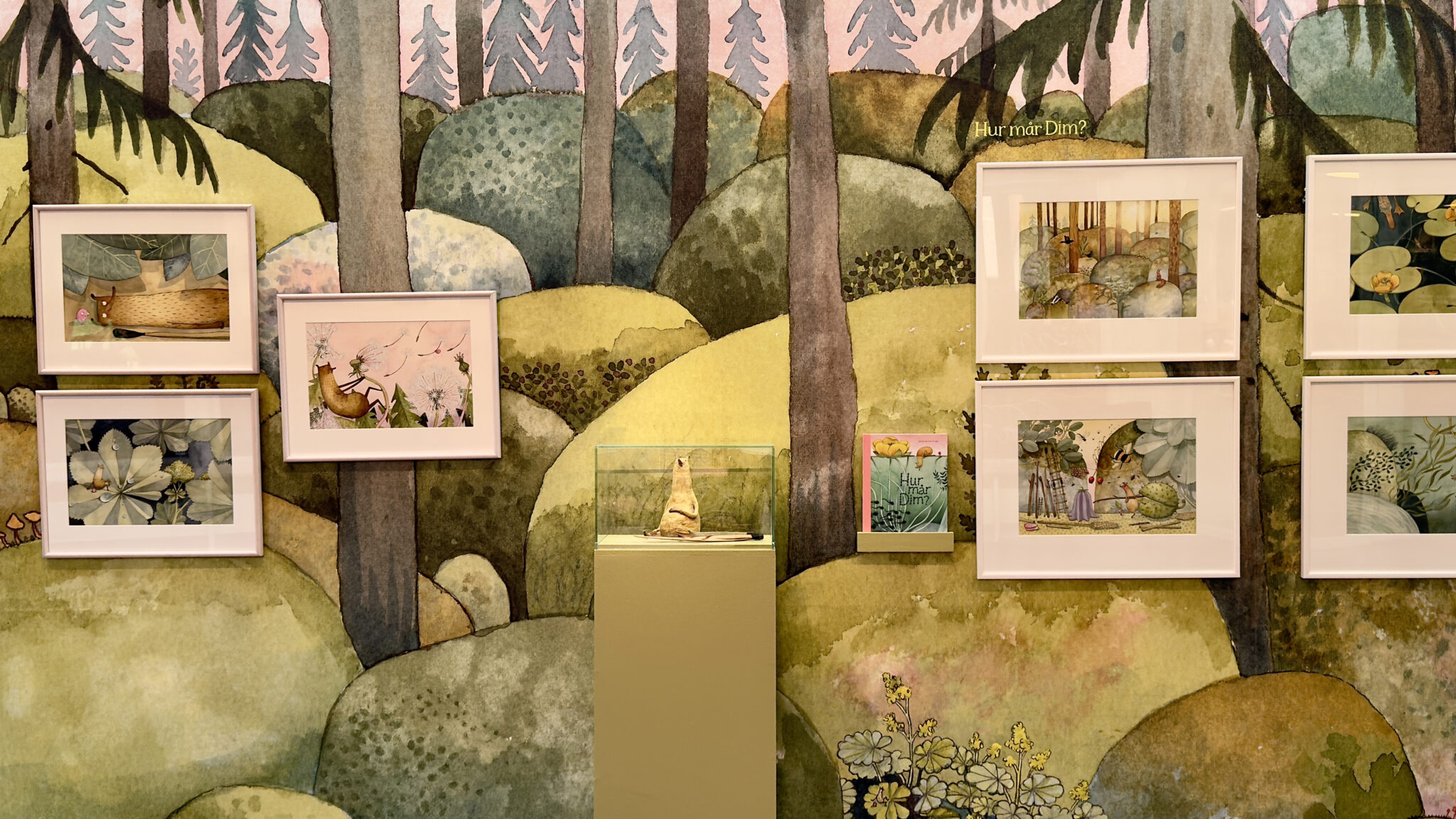 Med sin karaktäristiska stil och harmoniska färgskala har Maria Nilsson Thore skapat en bilderboksvärld som är lätt att känna igen och lockande att kliva in i. I utställningen visas originalbilder i ett utställningsrum som gestaltats med inspiration från böckerna. Bilderna är målade med akvarellfärg i flera lager på stora papper. Maria Nilsson Thore har varit konsekvent med sin färgskala över tid. Ofta går bilderna i dämpade pastelliga nyanser, ibland med någon enstaka röd detalj. Vissa nyanser av klarblått tål hon bara inte.